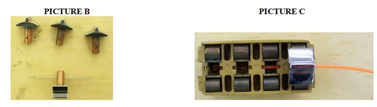 The pictures show the refurbishment of a 1953 Cadillac 4-gang switch, but the 1949 switch is the same as in all functional respects; only the chrome is a little different. Picture A shows a 4-gang switch disassembled. The orange wire or rod is weed wacker line, .095” in diameter. I have also used the tip off a broken fly rod instead, but finding broken fly rods is not easy!